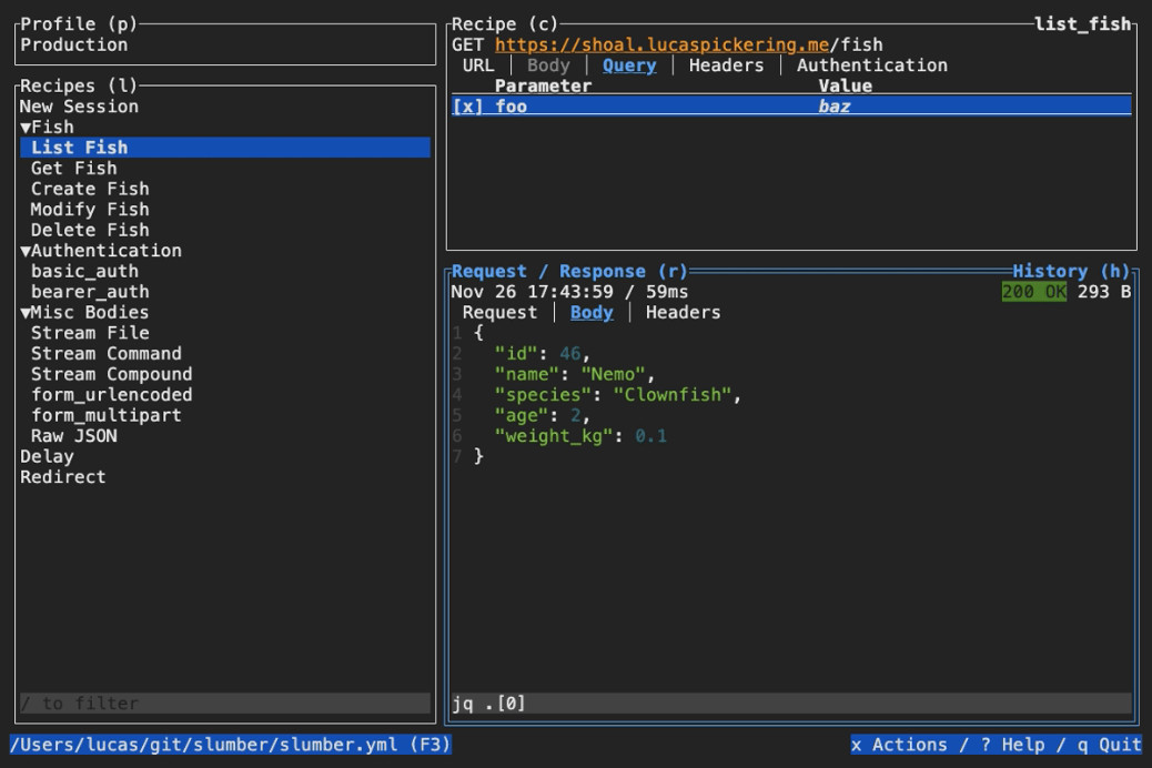 Slumber je terminálový HTTP/REST klient, který je určený primárně pro vývojáře pro rychlou a plně konfigurovatelnou práci s API. Klient umožňuje definovat, spouštět a sdílet HTTP požadavky pomocí jednoduchých textových konfigurací, které lze verzovat a uchovávat lokálně. Uživatel může využít i předem připravené skupiny definovaných požadavků, které slouží jako opakovaně použitelné šablony pro komunikaci s API.
