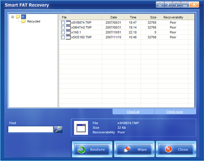 Smart FAT Recovery je užitečná pomůcka pro obnovení nechtěně smazaných či poškozených dat v souborových systémech typu FAT 12/16/32. Záchrana a obnovení souborů je možná z pevného disku, USB klíčenek, paměťových karet apod.