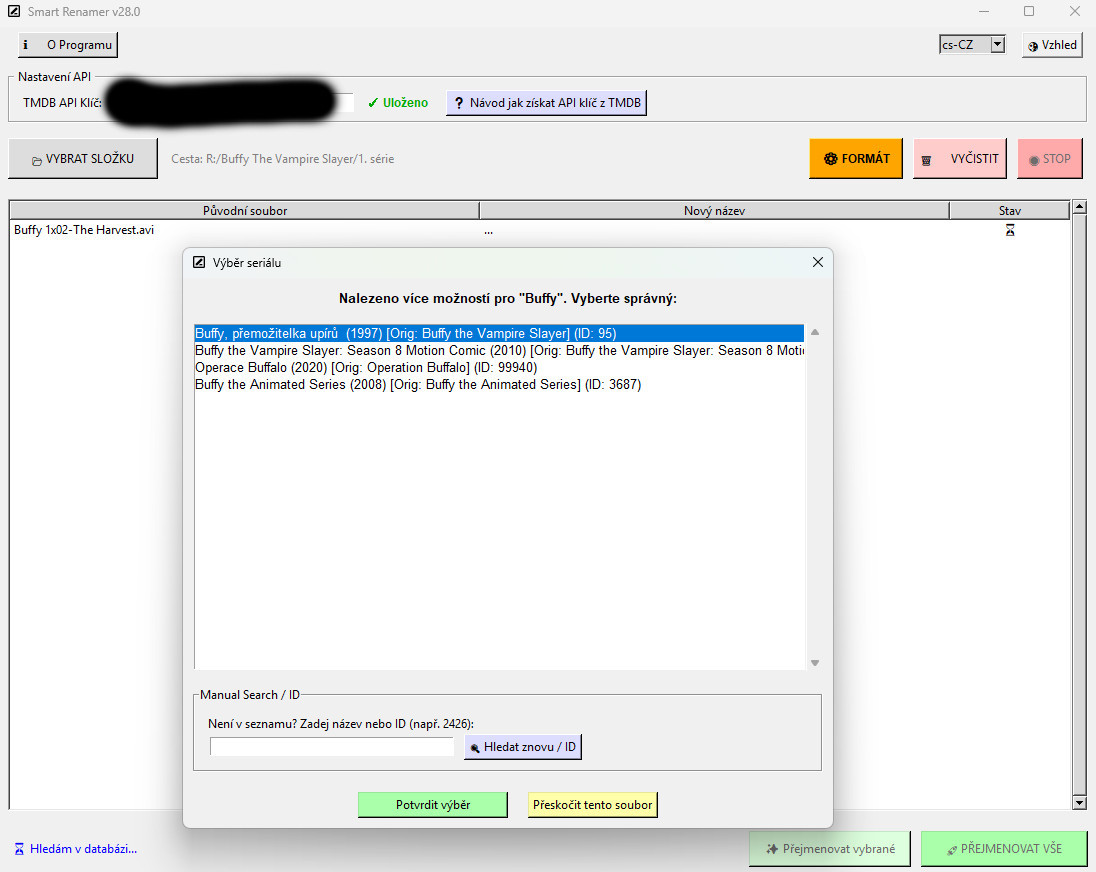 Smart Series Renamer je výkonný nástroj pro automatickou organizaci vaší digitální knihovny seriálů. Už žádné ruční přepisování názvů jako "s01e01.mkv". Program využívá rozsáhlou databázi TheMovieDB (TMDB), díky které okamžitě rozpozná seriál, sérii i epizodu a přejmenuje soubor do úhledného formátu.