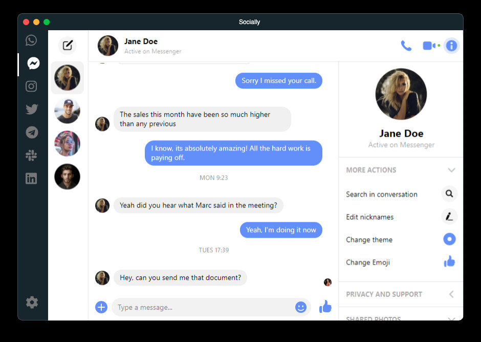 Socially je software sloužící pro pohodlný přístup k oblíbeným sociálním sítím nebo komunikačním službám z jednoho místa. Program podporuje platformy WhatsApp, Messenger, Instagram, Twitter, Telegram, Slack a LinkedIn. Samozřejmostí je možnost snadného přepínání mezi uvedenými platformami.
