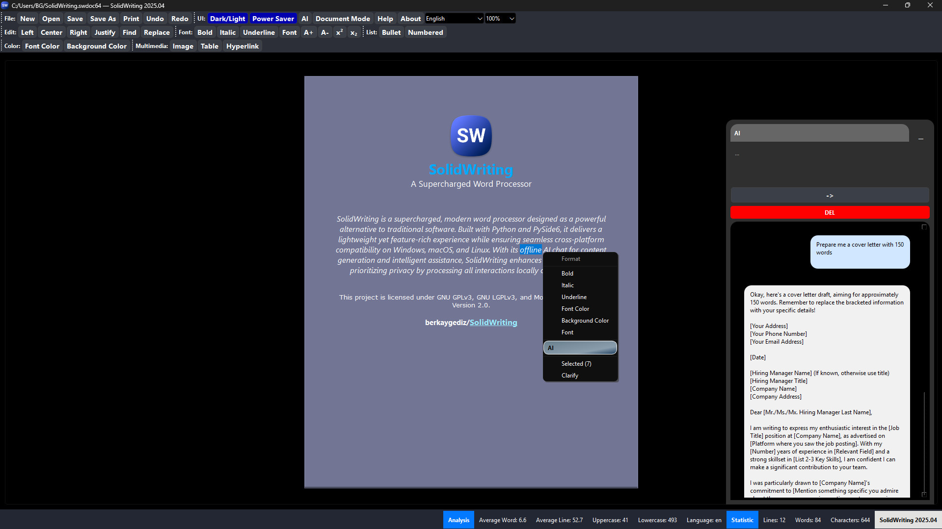 SolidWriting je klasický textový editor, který kromě všech standardních funkcí nabízí také možnost využití AI asistenta. Editor podporuje práci s dokumenty ve formátech SWDOC, SWDOC64, DOCX, TXT a HTML.
