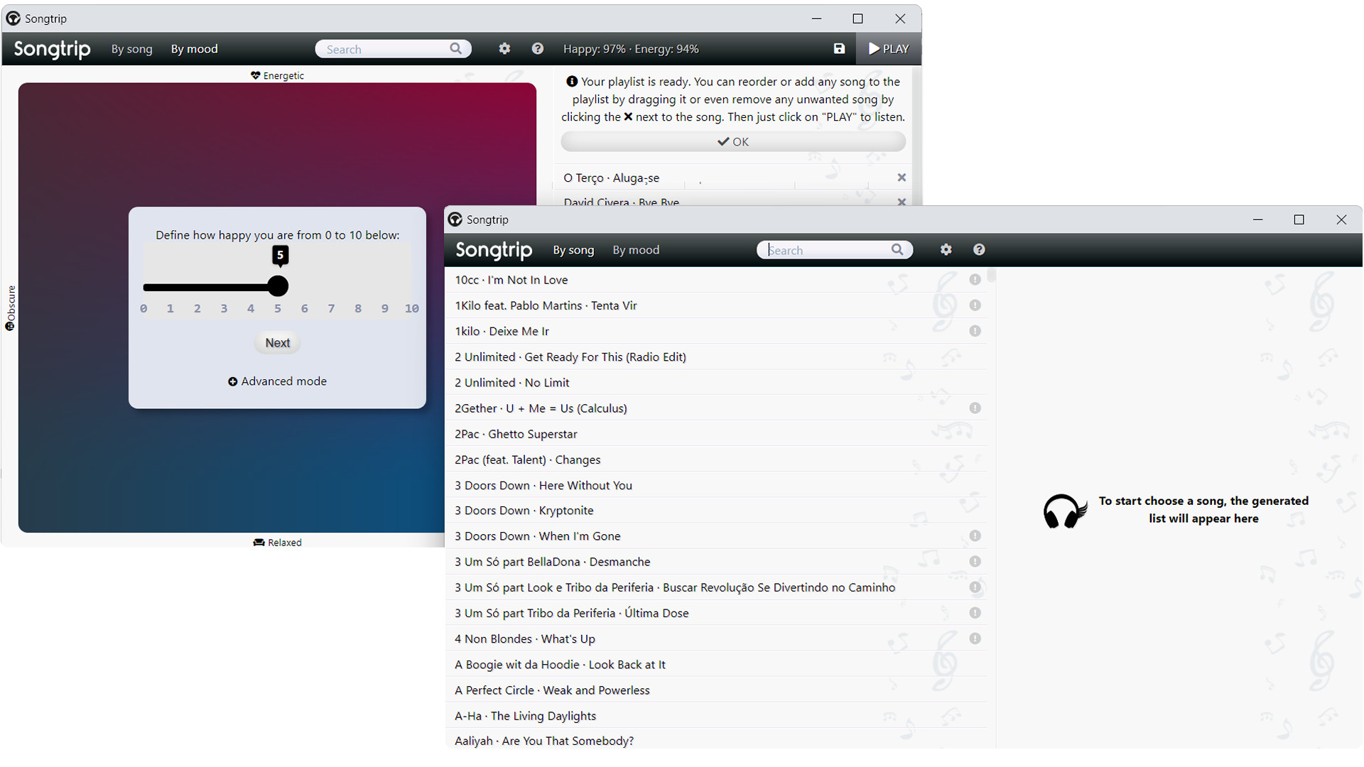 Songtrip je aplikace, která dokáže automaticky generovat hudební playlisty na základě aktuální nálady uživatele nebo podle uložených metadat. Lze tak ušetřit čas s složitou a zdlouhavou tvorbou plylistu. Program je v podstatě alternativou ke službě iTunes Genius.