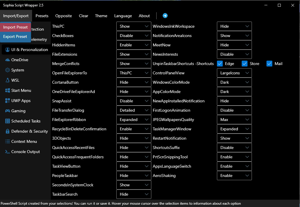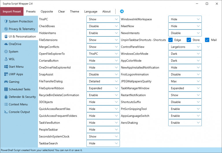 Sophia Script Wrapper je pomůcka, díky níž lze snadno vytvořit vlastní PowerShell skript s uživatelským rozhraním, který pak slouží pro detailní nastavení Windows (tweakování) a pro odstranění nechtěných předinstalovaných aplikací (bloatware). Nastavením jednotlivých voleb je automaticky generován skript, který lze přímo spustit nebo uložit do souboru.
