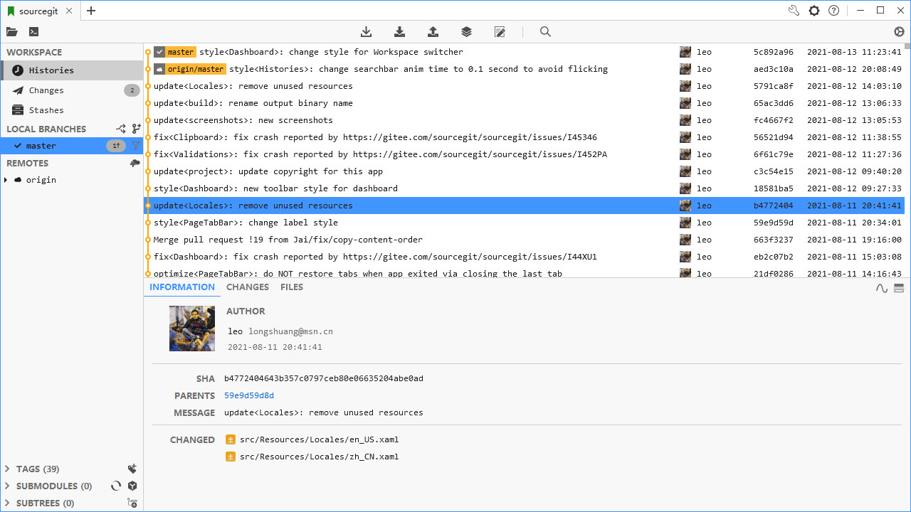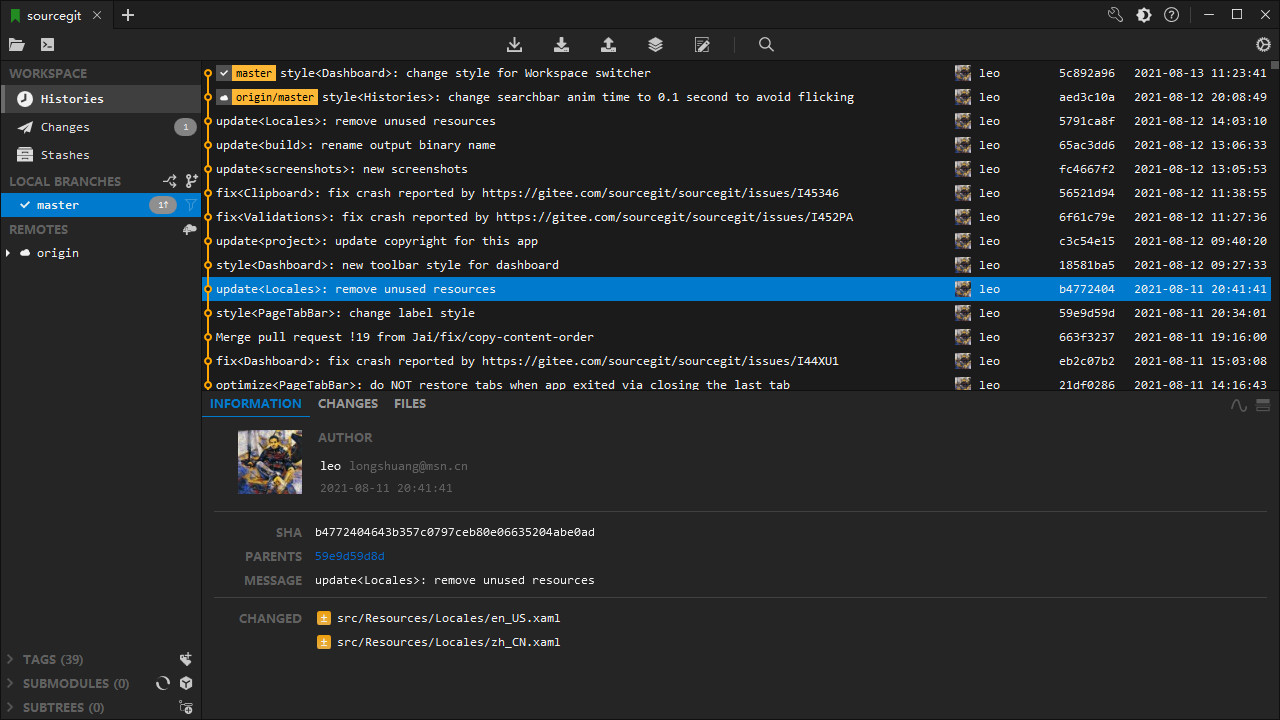 SourceGit je užitečný GIT klient s přehledným grafickým rozhraním, který nabízí prezentaci commitů pomocí grafu. Program podporuje samostatný SSH přístup pro každý remote a umožňuje používat standardní GIT příkazy jako například clone, fetch, pull, push a také funkce a vlastnosti branches, remotes, tags, stashes, submodules, subtrees, archive a mnoho dalších.