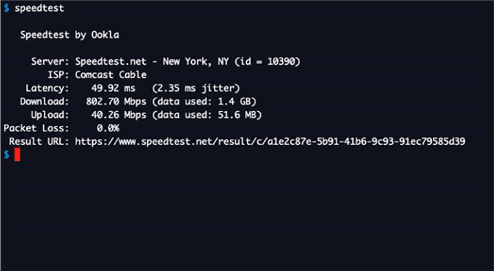 Speedtest CLI je jednoduchý nástroj pro měření rychlosti připojení k Internetu pomocí příkazového řádku. Program je určen především pro vývojáře a síťové administrátory. K dispozici jsou údaje o rychlosti stahování a uploadu, latenci, ztrátovosti packetů a další. Podporovány jsou skripty a export výsledů do formátů CSV, JSONL nebo JSON