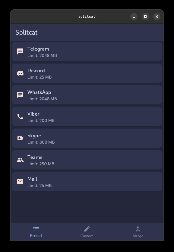 Splitcat je aplikace určená pro rozdělení nebo naopak spojování velkých souborů na základě předdefinovaných limitů velikosti různých aplikací (Telegram, WhatsApp, Viber, Discord,...). Limit velikosti rozdělených souborů lze samozřejmě nastavit libovolně respektive manuálně. Takto rozdělené soubory lze pak zase snadno sloučit do jednoho. Program není potřeba instalovat.
