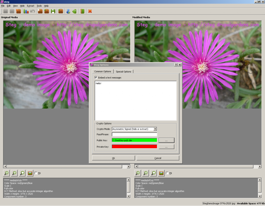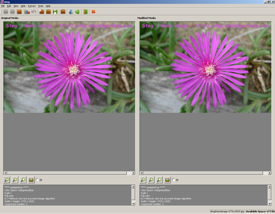 Steg je přehledný a snadno ovladatelný steganografický nástroj pro šifrování dat do obrázků a fotografií typu JPEG (JPG), TIFF, PNG a BMP. Přímo zvolených obrázků je možné zašifrovat například textové i datové soubory. Program se nemusí instalovat.