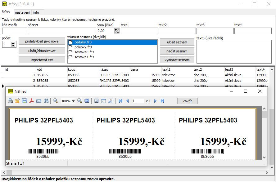 Štítky je program pro hromadný tisk štítků (např. popisky na zboží, regálové cenovky, polepky na různá zařízení, jmenovky...). integrovaný vizuální návrhář tiskových sestav umožňuje pohodlné vytváření a úpravy libovolného množství přednastavených sestav (profilů pro tisk), podpora pro import z Money S3 - tisk štítků a cedulek na zboží z příjemek nebo zásob na skladě. Videoukázky na webové stránce programu.
