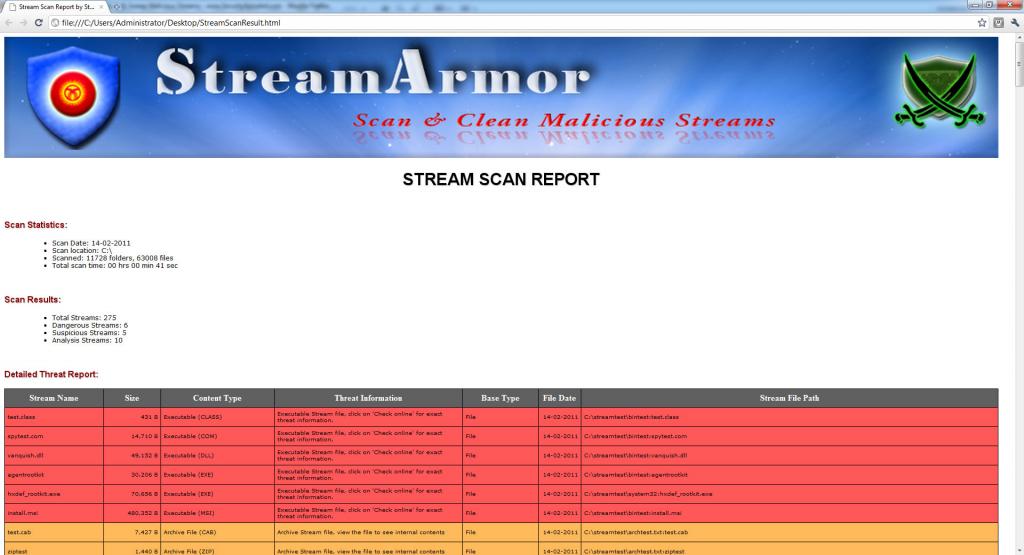 Stream Armor je pokročilý nástroj pro vyhledávání a případné odstranění skrytých alternativních datových toků (ADS - Hidden Alternate Data Streams). Program vyhledává veškeré datové toky a navíc je dokáže přehledně barevně rozlišit dle stupně nebezpečnosti. Uživateli může tak pomoci například s odhalením spyware, virů a dalších škodlivých programů a kódů.