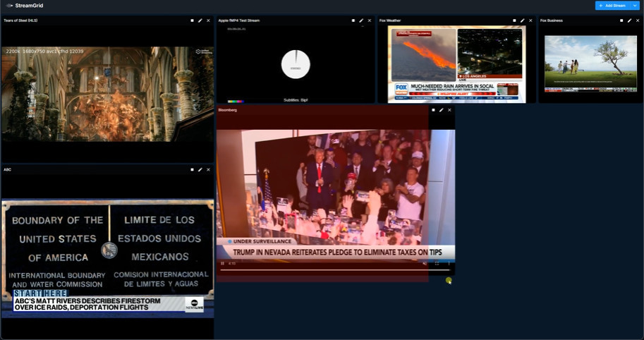 StreamGrid je přehrávač umožňující sledování několika video streamů současně s možností jejich uspořádání v hlavním okně programu. V rámci správy sledovaných streamů je možné přidávat nové streamy s vlastními názvy a logy, trvale ukládat jejich rozložení pro budoucí použití nebo exportovat a importovat nastavení.