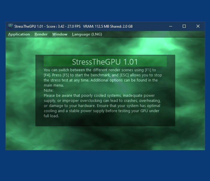 StressTheGPU je pomůcka pro rychlé stresové otestování výkonu grafické karty počítače (GPU) a pro vyhodnocení toho, jak GPU zvládá náročné úlohy. Výkonové parametry lze při testování sledovat v reálném čase a to i včetně FPS a teploty GPU. Výsledná data lze pak navíc porovnat s výsledky nejlepších grafických karet na trhu.