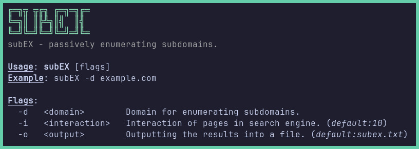 subEX je jednoduchá pomůcka ovládaná pomocí příkazového řádku, která provádí pasivní výčet subdomén. K tomu program využívá různé online zdroje a vyhledávácí enginy, včetně Google dorks. Výpis subdomén lze ukládat přímo do souboru.