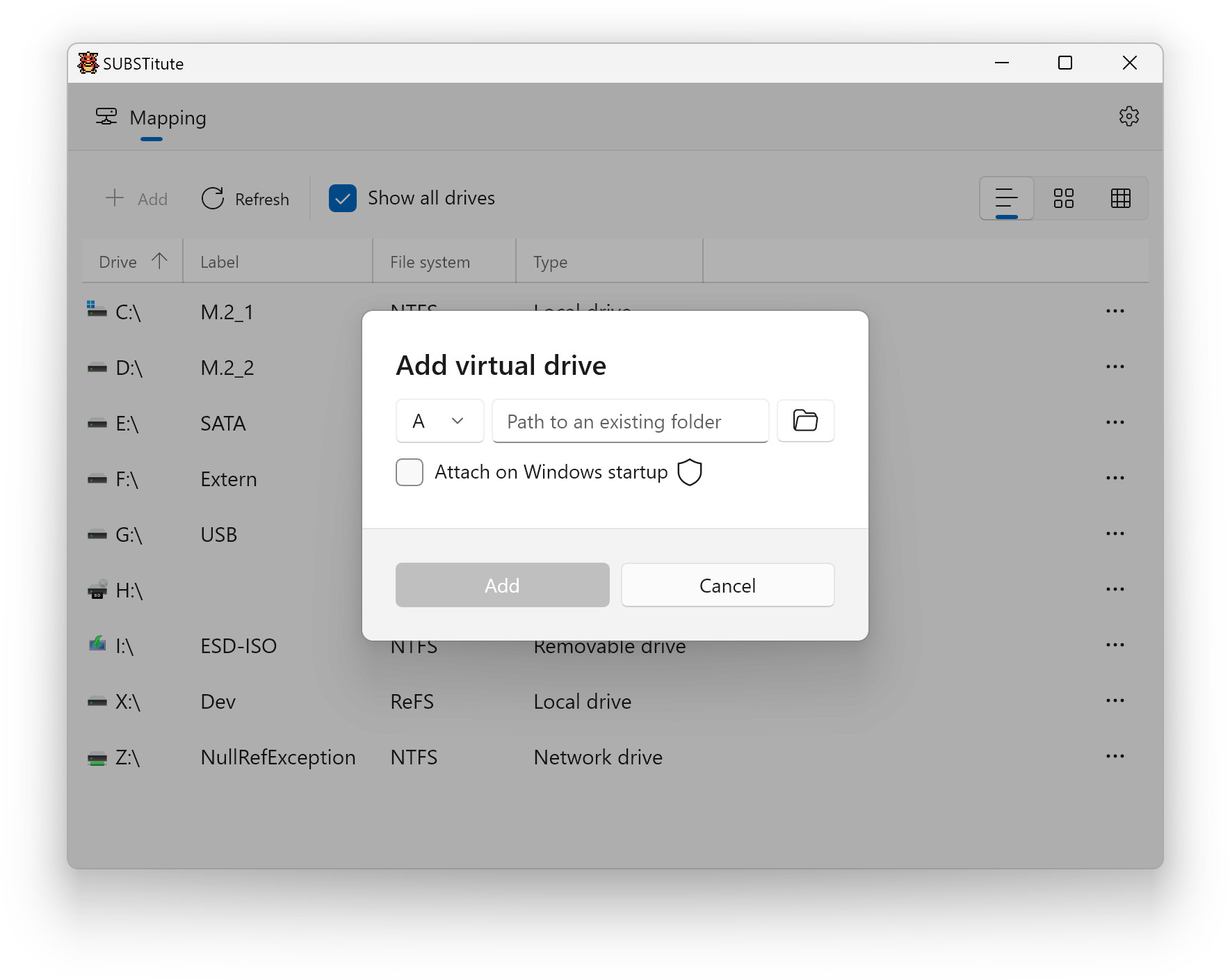SUBSTitute je pomocník respektive grafické rozhraní umožňující namapovat vybrané často používané složky jako virtuální disky. Program umožňuje zobrazit všechny disky i jejich typy, přidat virtuální disk a namapovat na něj zvolenou složku (adresář). Zobrazit je možné několik pohledů pro zobrazení všech diskových jednotek.