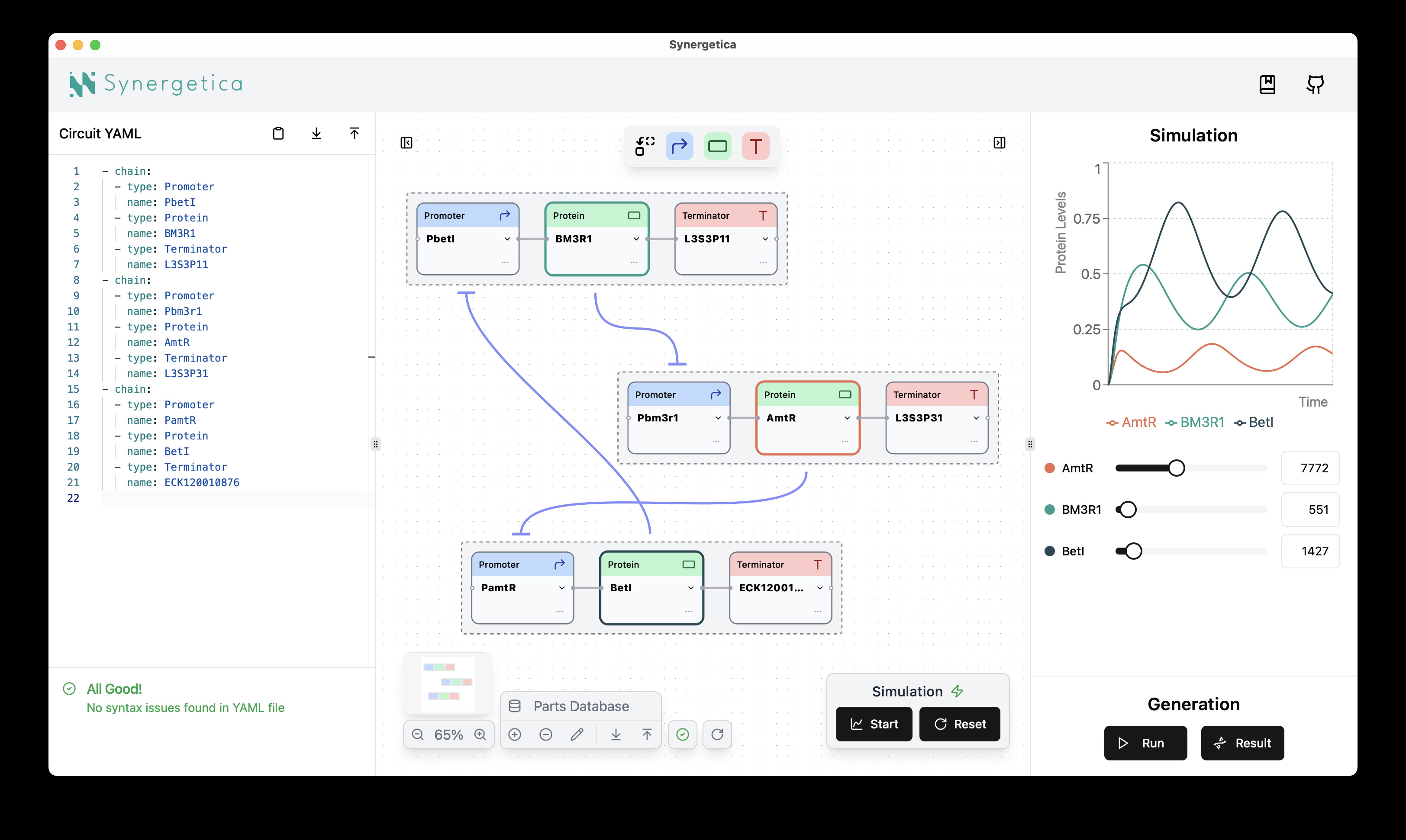 Synergetica provádí interaktivní simulaci hladin exprese proteinů v navržených obvodech. Na základě parametrů získaných z těchto simulací lze pak automaticky generovat odpovídající DNA sekvence. Podporováno je také přidávání a úprava dalších genetických komponent.