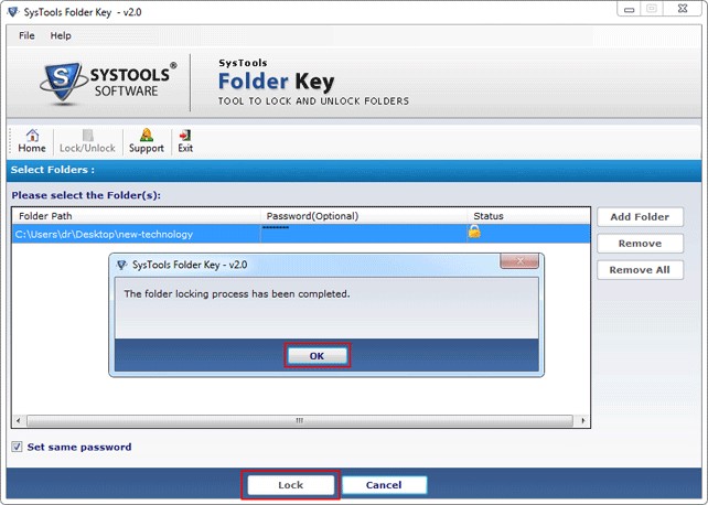 SysTools Folder Key je jednoduchý nástroj pro ochranu vybraných složek (adresářů) pomocí jejich uzamčení. Pro uzamčení i opětovné odemčení složky je nutné zadat zvolené heslo. Program má velmi snadné ovládání.