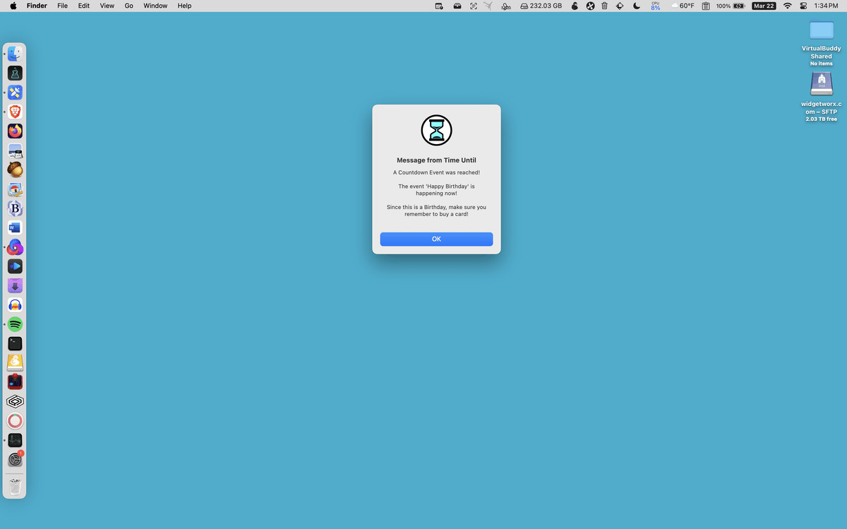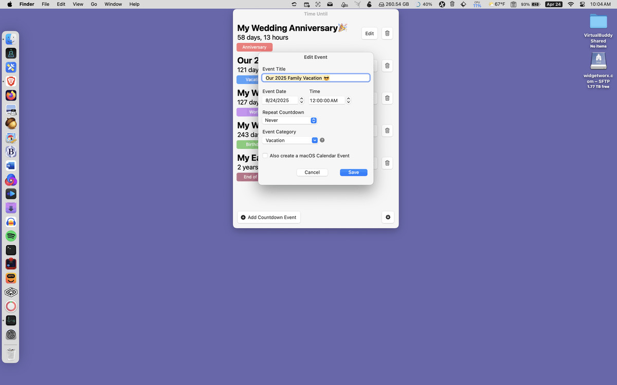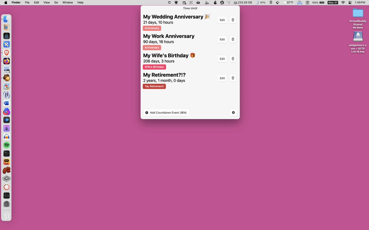 Time Until for Mac je nástroj běžící na pozadí v oblasti menu baru, který dokáže sledovat odpočet času do různých událostí. Sledovat lze najednou až 10 různých odpočtů. Odpočítávat lze čas do událostí typu narozeniny, svátky, schůzky, dovolená apod. Ke každé události je možné navíc přiřadit kategorii a pak je lze třídit podle abecedy nebo typu. Možné je i automatické opakování odpočtu denně, týdně, měsíčně, čtvrtletně či ročně.