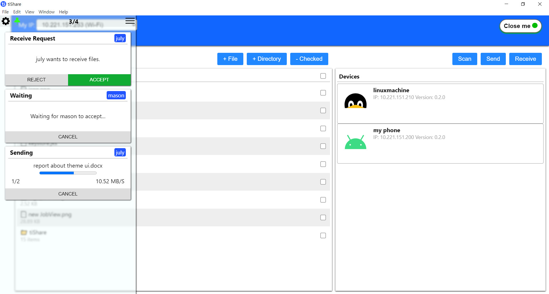 tiShare je aplikace, která slouží pro pohodlné sdílení složek a souborů mezi počítači i dalšími zařízeními v lokální síti. Podporována jsou zařízení se systémy Windows, Android i Linux. Program vyžaduje připojení obou stran přenosové relace do stejné sítě. Každé takové zařízení v síti pak obdrží unikátní ID, které společně s IP adresou slouží k jeho rozpoznání po identifikaci všech zařízení v dosahu.
