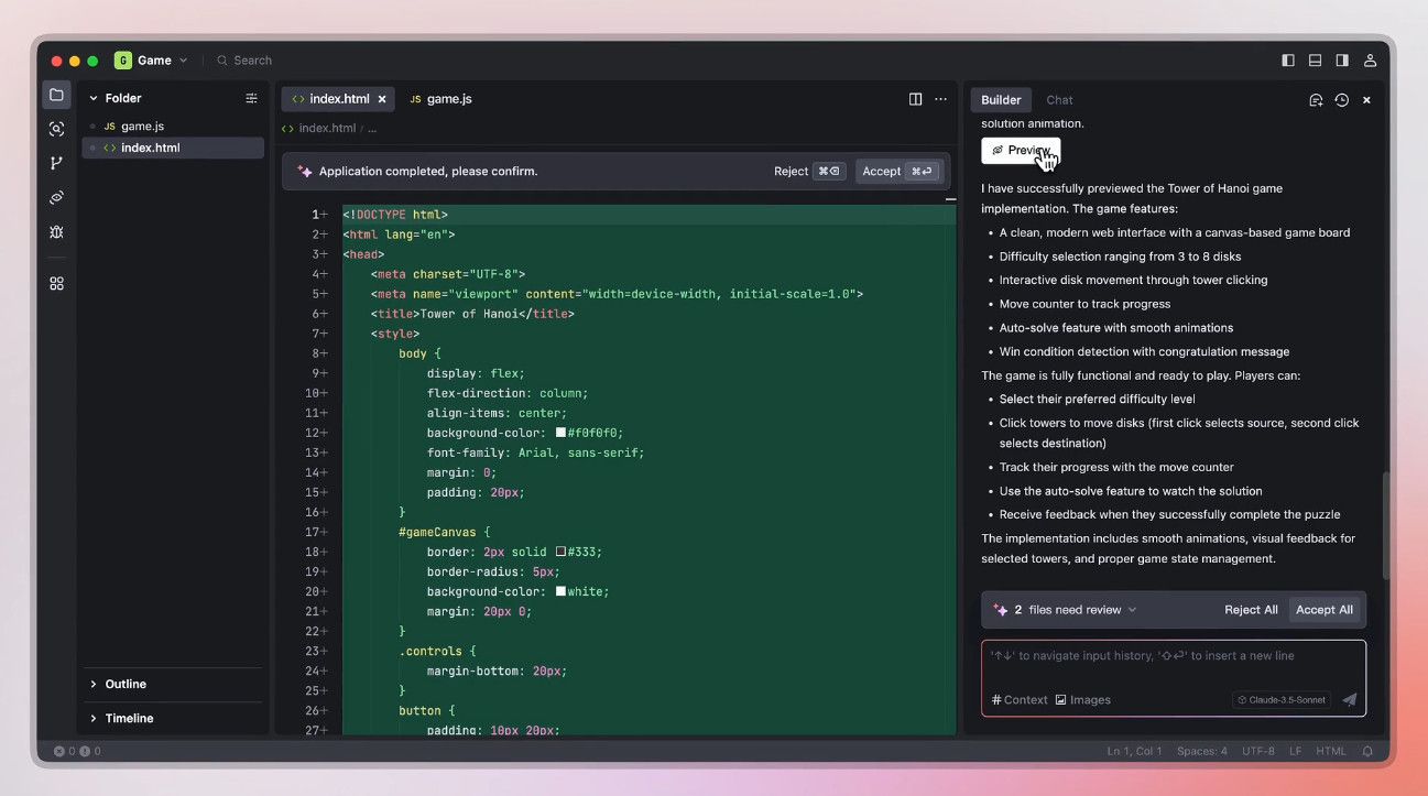 Trae na základě požadavků uživatele automaticky generuje relevantní bloky kódu. Pomocí režimů Builder a Chat lze pak vytvářet a spravovat úkoly a přitom lze komunikovat s interaktivním vestavěným AI asistentem.