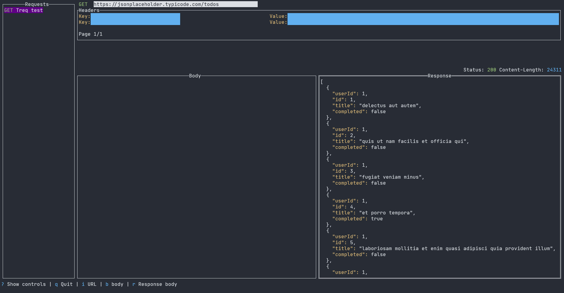 treq je terminálový nástroj vytvořený v Go, který slouží pro vykonávání a ukládání HTTP požadavků. HTTP požadavky lze ukládat do SQLite databáze, která je součástí programu.