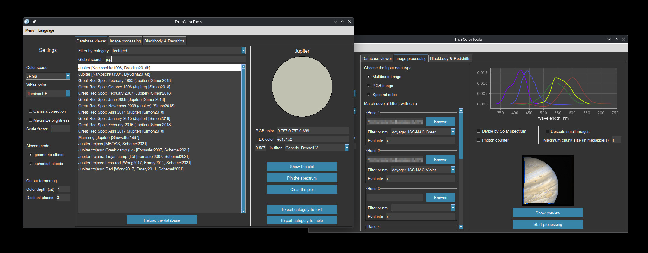 TrueColorTools je aplikace sloužící pro výpočet viditelných barev nebeských těles z jejich fotometrických dat. Program využívá využívá konstrukci spektra a absorpci světla v lidském oku k výpočtu realistických barev nebeských těles.
