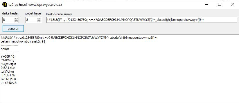 Tvůrce hesel je jednoduchá utilita pro generování libovolného počtu hesel, libovolné délky z libovolného počtu volitelných znaků.
