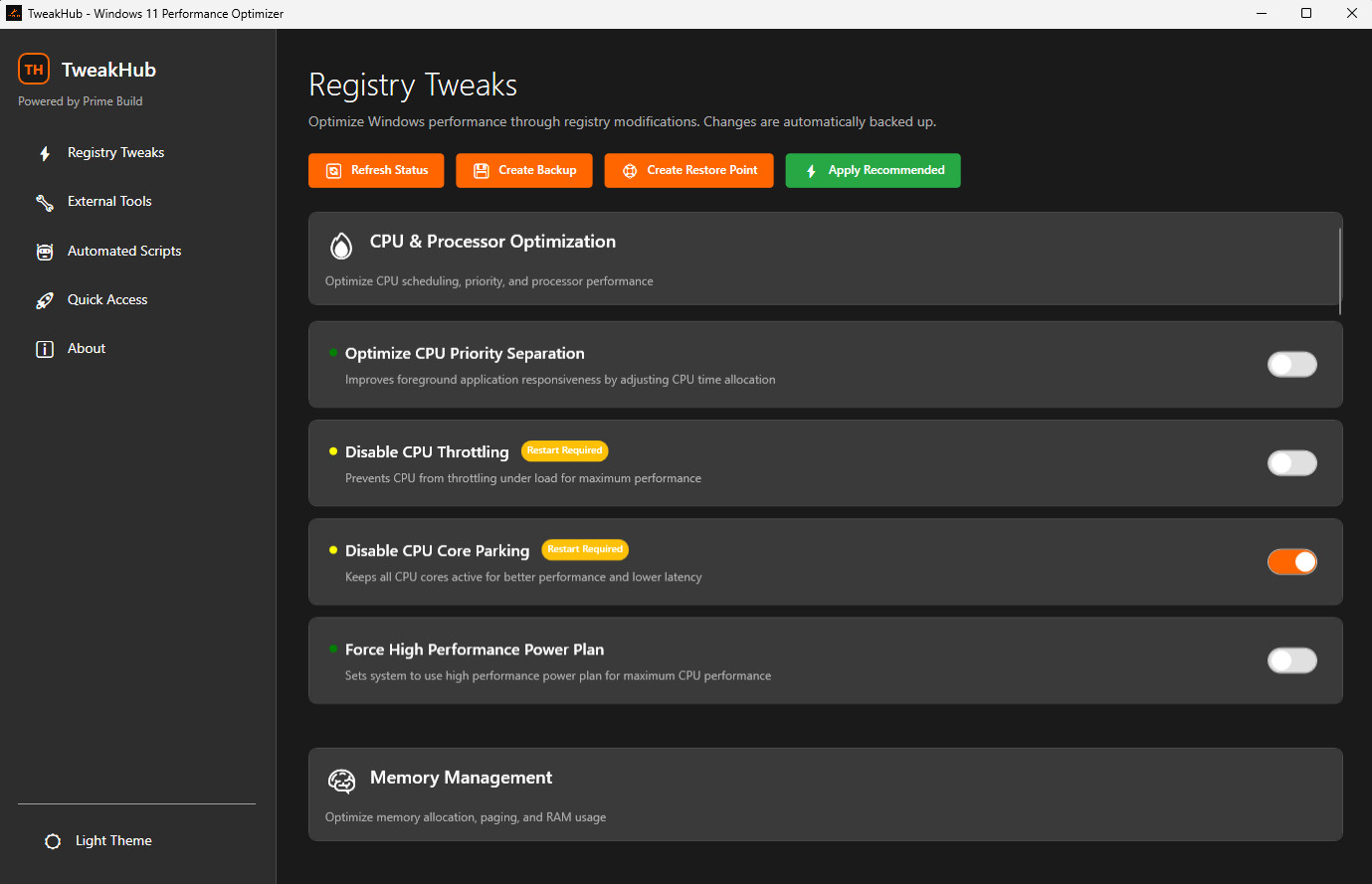 TweakHub provádí změny v registrech a systémových nastaveních, proto je vždy doporučeno zálohování systému a spuštění aplikace s právy administrátora. Program není potřeba instalovat.