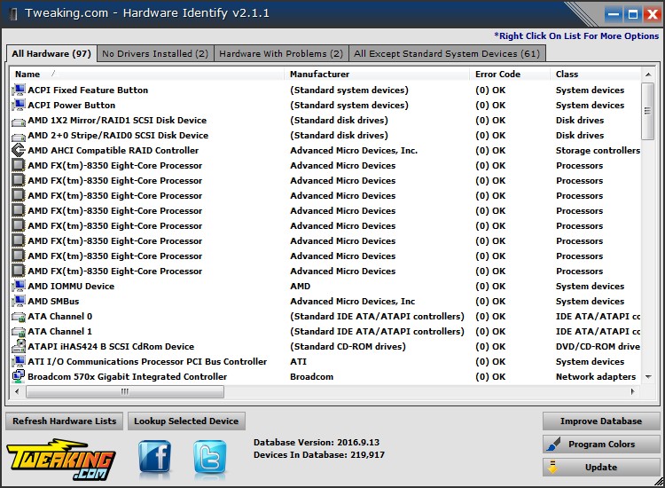 Tweaking.com - Hardware Identify je užitečná pomůcka, které vypíše seznam veškerého instalovaného hardware a ve zvláštní záložce zobrazí seznam hardware, který nebyl rozpoznán nebo nebyl instalován jeho ovladač. Podrobnosti lze vyhledávat přímo z programu na Google podle zjištěného ID hardware. Program není potřeba instalovat.
