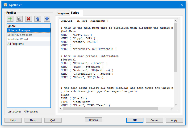 TypeButler je aplikace pro rychlé a pohodlné vkládání často používaných částí textu respektive textových fragmentů. Vkládat lze jednotlivá slova, celé věty či odstavce, části e-mailů apod. Uživatel si může předdefinovat textové bloky a vkládat je použitím rozšířeného kontextového menu. Podporována je také tvorba skriptů, díky nímž lze upravit kontextové menu pro každý program či textový editor samostatně.