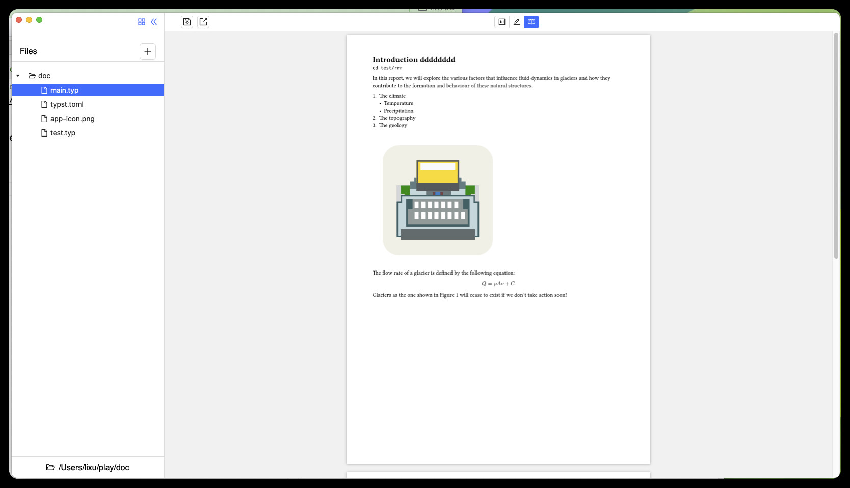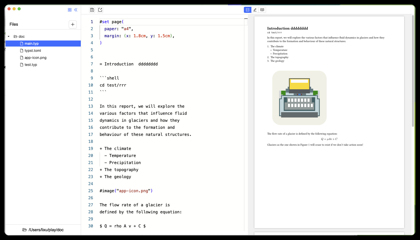 Jazyk Typst nabízí vestavěné značkování pro běžné formátování, flexibilní funkce pro komplexnější úkoly a také v sobě integruje skriptovací systém. Editor dokáže automaticky doplňovat chybějící kód, umožňuje export do PDF nebo a k dispozici je také poradce při chybách.