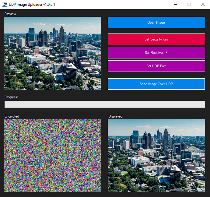 UDP Image Uploader je užitečný pomocník pro snadný přenos zašifrovaného obrázku nebo fotografie z počítače na displej připojený k mikrokontroléru přes Wi-Fi a pomocí protokolu UDP. Uživatel v programu vybere obrázek, nastaví bezpečnostní klíč, určí IP adresu příjemce a nastaví UDP port. Program není nutné instalovat.