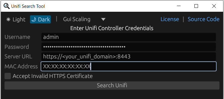 Standardně Unifi umožňuje vyhledat zařízení ve všech stránkách controllerů, což je užitečné například při vyhledání zařízení, které bylo připojeno na konkrétní webovou stránku. Po zadání údajů o Unifi controlleru a MAC adresy zařízení nástroj zobrazí, na které stránce bylo zařízení přijato.