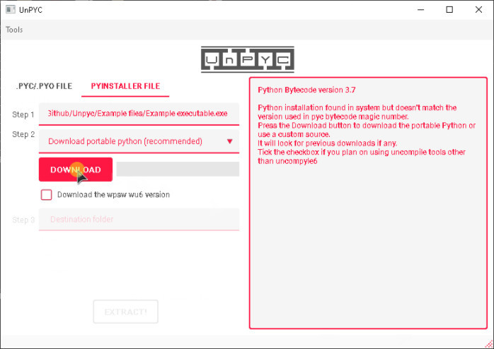 UnPYC je program určený pro dekompilaci Python bytecode (.pyc/.pyo) zpět do formátu Python (.py). Dekompylovat lze "bajtkód" ve verzích 2.6 až 3.8. možná je také extrakce pyinstaller balíčku pomocí nástroje "pyinstextractor". Předchozí instalace Pythonu ne počítači není vyžadována.