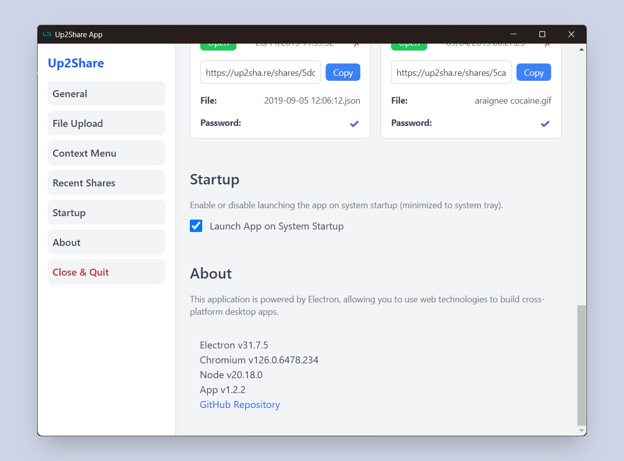Up2Share je nástroj umožňující snadné a bezpečné sdílení souborů. Soubory lze nahrávat a generovat odkazy na jejich sdílení s možností nastavení expirace a ochrany heslem. Nechybí ani možnost šifrování souborů a rychlé sdílení přes pravé tlačítko myši. Program požaduje prvotní autentizaci prostřednictvím API klíče, který lze vygenerovat po registraci uživatelského účtu.