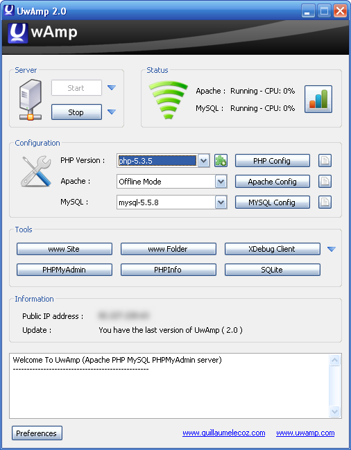 UwAmp je soubor nástrojů pro přehlednou správu a monitorování Apache a MySQL serverů. Program není potřeba instalovat a obsahuje nástroje: