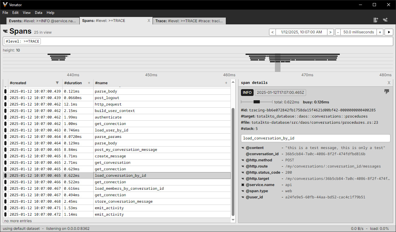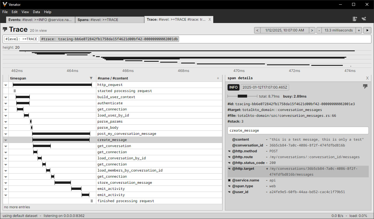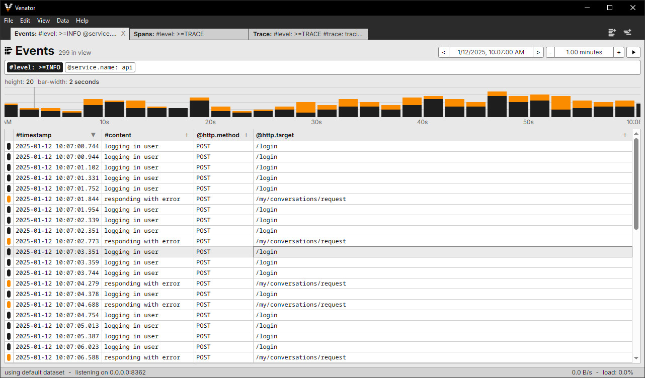 Venator je nástroj sloužící k prohlížení protokolů a trasování z OpenTelemetry a trasovacího ekosystému Rust. Nástroj dokáže přijímat data přes gRPC i HTTP/Protobuf a v reálném čase je zobrazovat, filtrovat a seskupovat podle úrovní, atributů a časových úseků. Díky integrovaným tabulkám, detailním panelům a přehledným grafům program umožňuje vývojářům lépe porozumět chování aplikace během jejího vývoje.