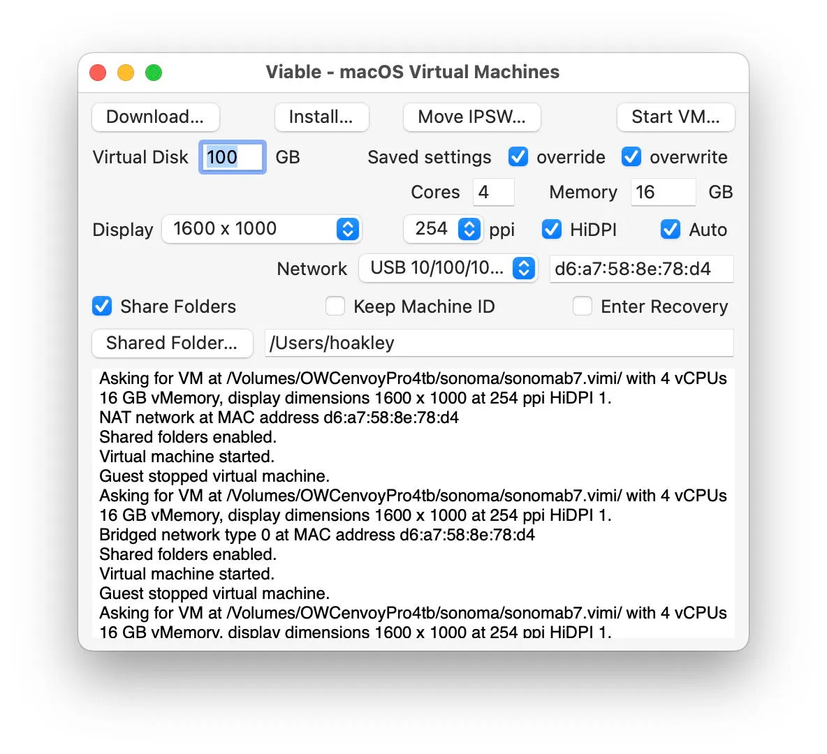 Viable for Mac je aplikace pro snadné vytváření a spouštění virtuálních strojů (virtual machines) na počítačích s macOS s procesory Apple Silicon. Dokáže použít obraz IPSW přímo od Apple nebo stažený v aplikaci a vytvořit z něj virtuální počítač. Podporuje také nastavení počtu jader, ale také paměti, rozlišení displeje a sdílených složek.