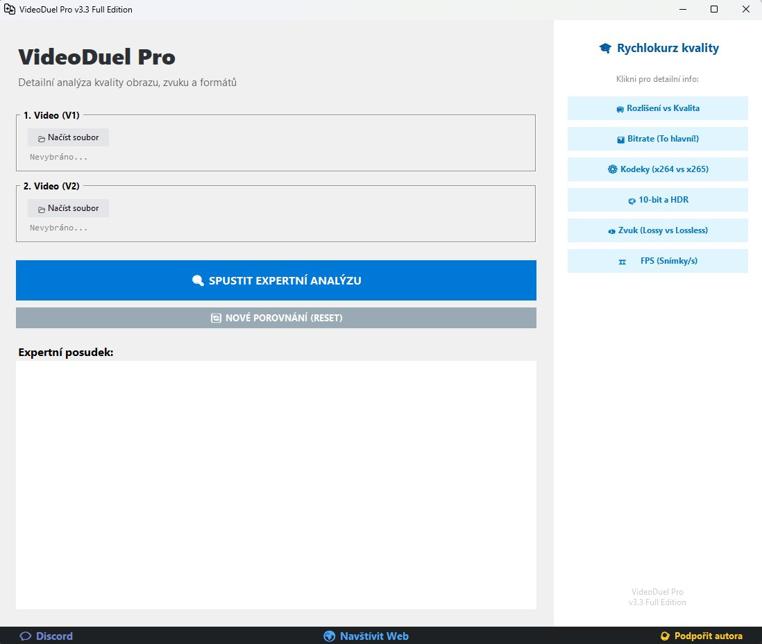 Na rozdíl od běžných přehrávačů VideoDuel nejde jen po rozlišení. Analyzuje skutečnou technickou kvalitu obrazu a zvuku. Podívá se "pod kapotu" vašich souborů a porovná datový tok (bitrate), použitý kodek (x264 vs HEVC/AV1), hloubku barev (8-bit vs 10-bit HDR) i kvalitu audia (Stereo vs 5.1/7.1).