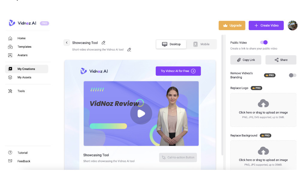 Vidnoz AI je aplikace sloužící pro vytváření zajímavých videí s realistickými avatary vytvořenými pomocí umělé inteligence (AI). Avataři disponují i hlasovými projevy a reálnými gesty. Program nabízí výběr z více než připravených 70 avatarů. Umožňuje zvolit šablonu a avatara, zadat skript (text), nastavit hlas a nakonec zahájit generování.