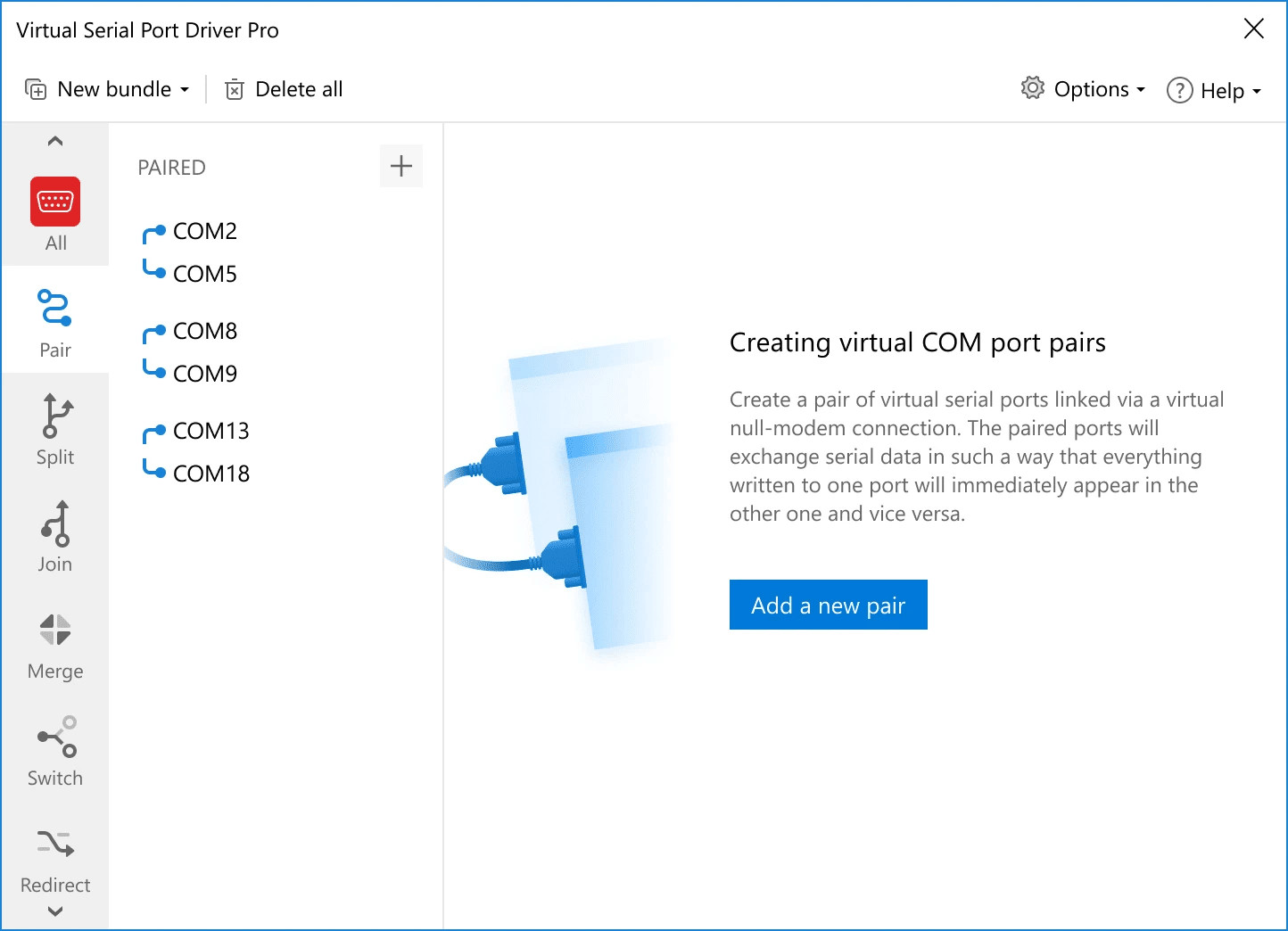Všechna data odeslaná na jeden virtuální COM port se okamžitě objeví na druhém a naopak. Jakmile je vytvořena dvojice virtuálních sériových portů, uživatelé je mohou nalézt v Správci zařízení. Jsou k dispozici pro použití při spuštění systému, dokonce ještě před přihlášením do systému.