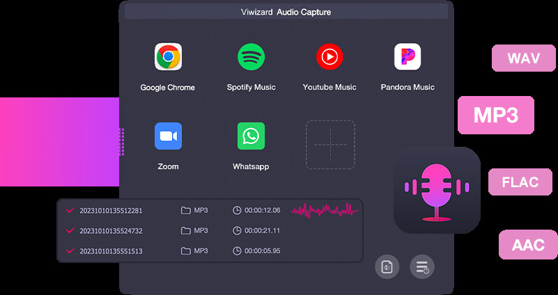ViWizard Audio Capture je aplikace určená pro záznam zvuku z počítače do audio souborů typu MP3, AAC, WAV, FLAC, M4A a M4B. Uživatel může snadno nahrát v podstatě jakýkoliv zvuk či audio včetně včetně streamované hudby, živých rádií, herních zvuků, hudby na pozadí, online schůzek atd. Program má přehledné a intuitivní ovládání.