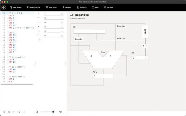 Simulátor také podporuje běžné příkazy Von Neumannova stroje, jako je například načítání dat (LOD), ukládání dat (STO), sčítání (ADD), odčítání (SUB), násobení (MUL), dělení (DIV) a skoky (JMZ/JMP).