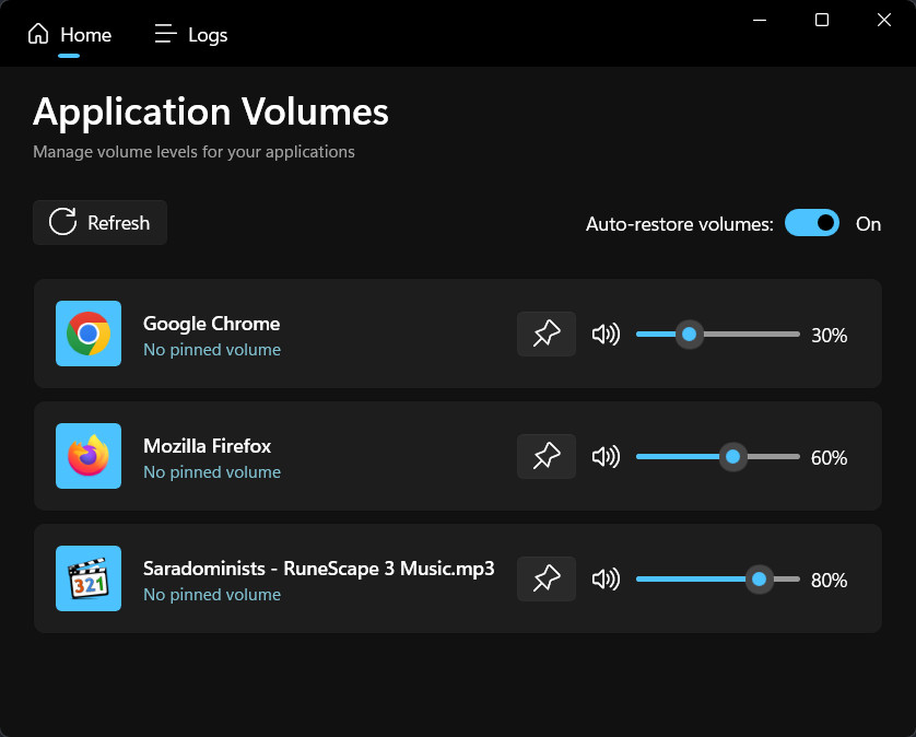 VolumeKeeper je nástroj, jehož pomocí lze nastavit a uložit úroveň hlasitosti zvuku pro každou vybranou aplikaci ve Windows. Nastavená úroveň hlasitosti je pak automaticky obnoven při spuštění dané aplikace. Výchozí uložení se provádění velice snadno "připnutím", tj. kliknutím na ikonu špendlíku. Program se nemusí instalovat.