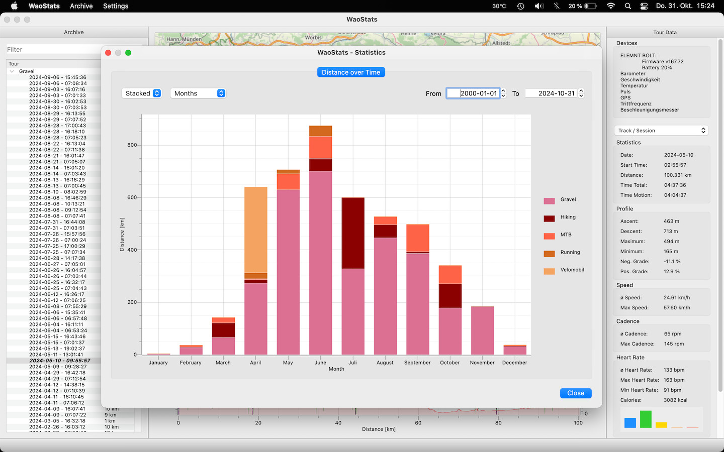 WaoStats je nástroj určený pro podrobnou analýzu a uložení všech zaznamenaných tras na cyklistických počítačích Wahoo ELEMNT. Uživatel může snadno provádět podrobnou analýzu uložených tras, včetně zobrazení různých statistik a grafů. Nechybí také nástroje pro archivaci a správu minulých tras, což usnadňuje sledování pokroku a plánování tréninků.