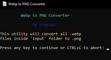 Webp to PNG Converter je skript sloužící pro hromadný převod obrázků ve formátu WebP do souborů typu PNG. Program je potřeba jen umístit do složky s WebP soubory, spustit jej a potvrdit konverzi.