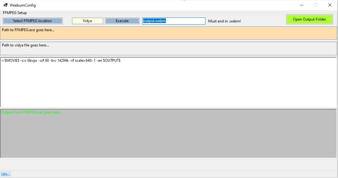 weebumconfig je nástroj sloužící pro převod video souborů v běžných formátech do formátu WebM. Program má velmi snadné ovládání a v podstatě se jedná o grafické rozhraní pro nástroj "ffmpeg.exe". Ten ale není součástí balíčku a v okně programu je nutné uvést jeho umístění na pevném disku.