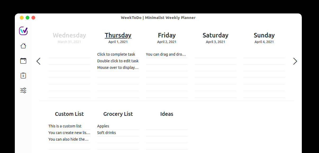 WeekToDo je aplikace sloužící jako přehledný plánovací kalendář a organizér pracovního i volného času. Program může pomocí se zvýšením produktivity práce a zpřehledňuje také správu různých úkolů. Primárně lze plánovat na týden dopředu, ale možné je i dlouhodobější plánování.