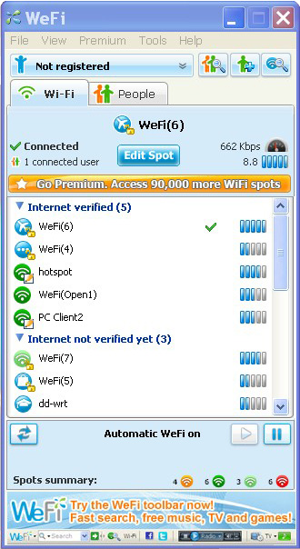 WeFi je užitečný a přehledný nástroj pro rychlé a snadné vyhledávání všech dostupných wi-fi hotspotů (přístupových bodů) ve vašem okolí. Program neustále monitoruje okolí uživatele a dokáže se automaticky připojovat k volným a co možná nejrychlejším hotspotům. Program je k dispozici ve variantách pro PC (Windows), Windows Mobile a Symbian.