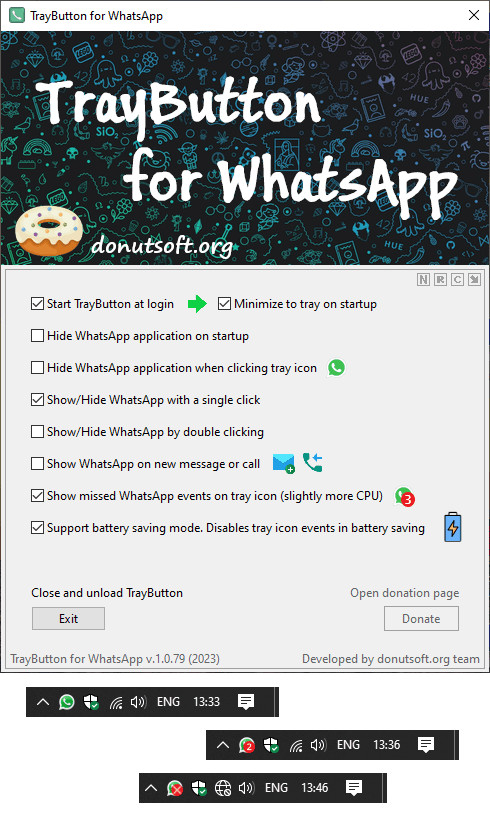 WhatsTrayButton je nástroj určený pro desktopovou aplikaci WhatsApp, který dokáže sledovat počet zmeškaných zpráv nebo hovorů při neaktivitě v aplikaci. Vše je zobrazeno v oznamovací oblasti v pravém spodním rohu obrazovky. Pomocí programu lze také automaticky otevřít okno WhatsApp při doručení nové zprávy nebo příchozím hovoru. Program není třeba instalovat.