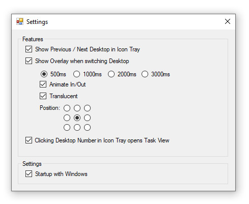 Windows Virtual Desktop Helper je aplikace určená pro přehlednou správu virtuálních ploch ve Windows 10 a 11. Program zobrazuje v oznamovací oblasti číslo aktuální virtuální plochy, zobrazuje také název plochy při přepnutí nebo předchozí plochu a také ukáže následující plochu kliknutím na ikonu programu v oznamovací oblasti.