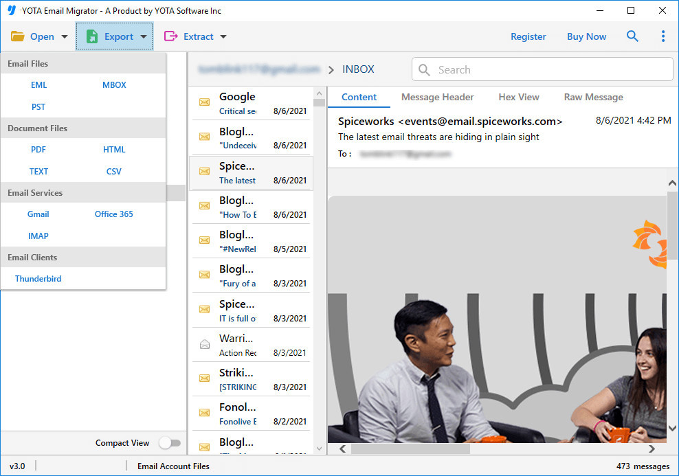YOTA Email Migrator je aplikace, která dokáže migrovat respektive přenést kompletní e-mailovou komunikaci nebo jen vybrané položky z libovolného poštovního klienta do zvolené webmailové online služby. Jedná se zejména o webové služby Office 365, Hotmail, Gmail, Yahoo Mail, Webmail a další. Při migraci lze navíc zcela zachovat původní strukturu složek. Program podporuje řadu formátů s exportovanými e-maily, včetně PST, MBOX, EML, PDF, TXT, OLM nebo OST.